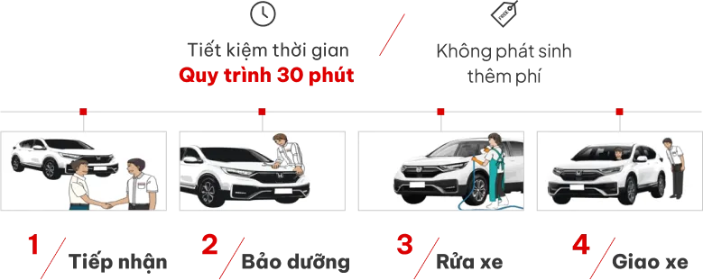 Dịch vụ Bảo dưỡng siêu tốc được thiết kế đặc biệt dành cho các cấp bảo dưỡng nhỏ (5.000km, 15.000km, 25.000km,…) với mục tiêu tiết kiệm thời gian quý giá cho Khách hàng, đảm bảo chất lượng tiêu chuẩn Honda. Thời gian từ khâu Tiếp nhận đến Giao xe chỉ với 30 phút, tương đương với thời gian Quý khách thưởng thức một ly trà hay đọc một mẩu tin tức