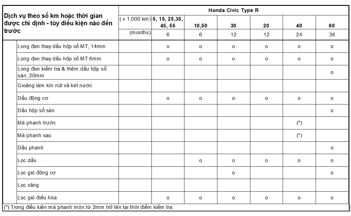 8. Ngoài các nội dung bảo hành nêu trên, dòng xe Honda Civic Type R được mở bán từ tháng 5 năm 2023 (sau đây gọi là “Honda Civic Type R”) được hưởng chính sách kiểm tra, sửa chữa, thay thế cho các phụ tùng với điều kiện theo bảng dưới đây trong 3 năm hoặc 60.000 km, tùy theo điều kiện nào đến trước.