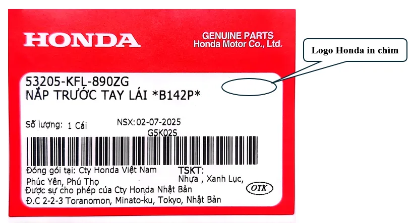 (Khi nhìn nghiêng dưới ánh sáng, góc trên bên phải trong phần màu trắng của tem có logo HONDA in chìm)