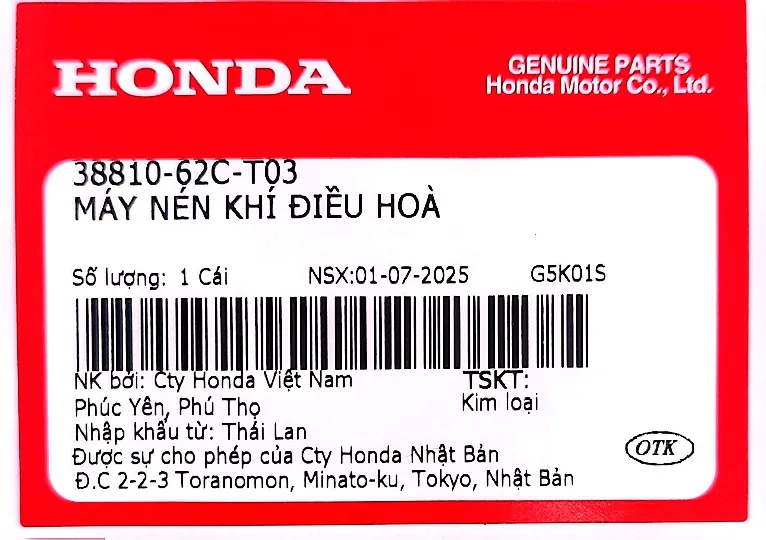 NSX từ ngày 01 tháng 07 năm 2025, tem có thay đổi địa chỉ Cty Honda Việt Nam