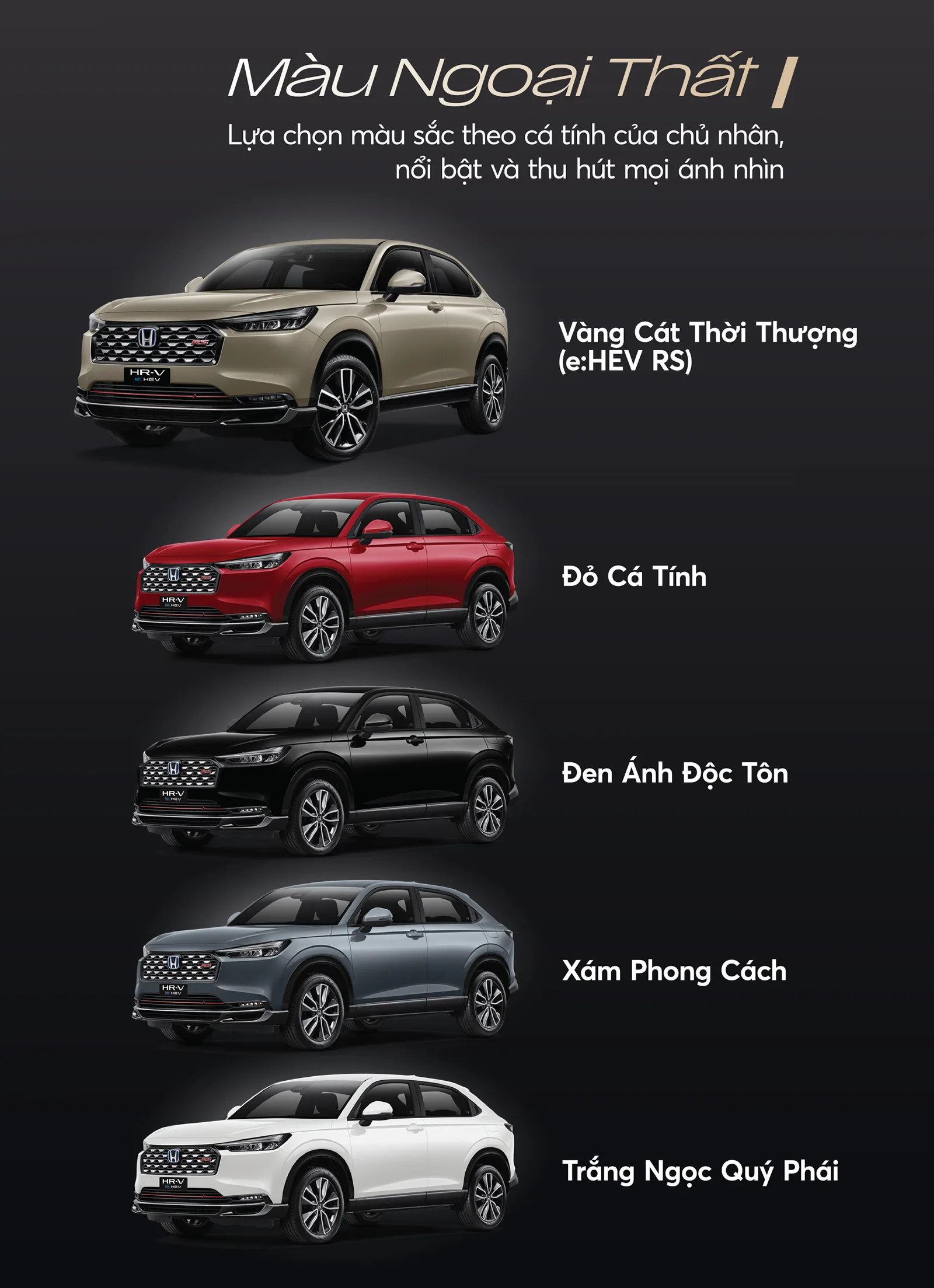 Honda HR-V mới 2026 được nhập khẩu nguyên chiếc từ Thái Lan với 2 loại động cơ: Hybrid và xăng trên các phiên bản, đi kèm tùy chọn màu sắc như sau: